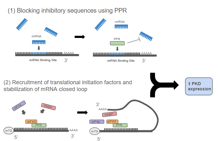 To boost PKD1 and PKD2 protein production, I engineered synthetic Pentatricopeptide Repeat (PPR) proteins—modular RNA-binding proteins capable of recognizing specific mRNA sequences. By fusing these PPRs to eIF4G, a key translation-promoting factor, I designed hybrid proteins that could both remove inhibitory barriers and stimulate translation.